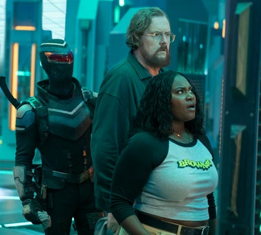 Adebayo decides to go for a walk around the neighborhood while Economos stays at Peacemaker’s house. Auggie returns to the house and attacks Economos, stabbing him in the hand. Economos admits they are from another dimension and the Peacemaker there now is not his son because Peacemaker killed his son. Auggie stops his attack and realizes things are very wrong.