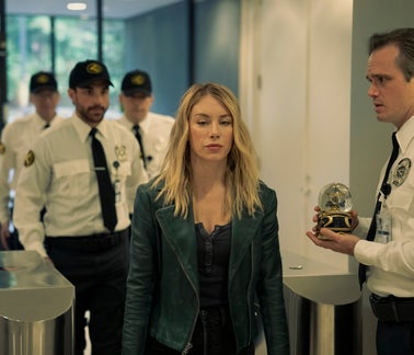 Keith enters and sees Harcourt. She closes the bathroom door to protect Adebayo, Economos and Vigilante. She holds a conversation with him where he notices she’s a lot different than the Harcourt he’s used to seeing. She’s wearing black and pants and talks about picking up a snow globe before heading into the ARGUS office. That snow globe is what Keith and Chris’ mother gave Peacemaker on her deathbed. He’s surprised but doesn’t stop her.